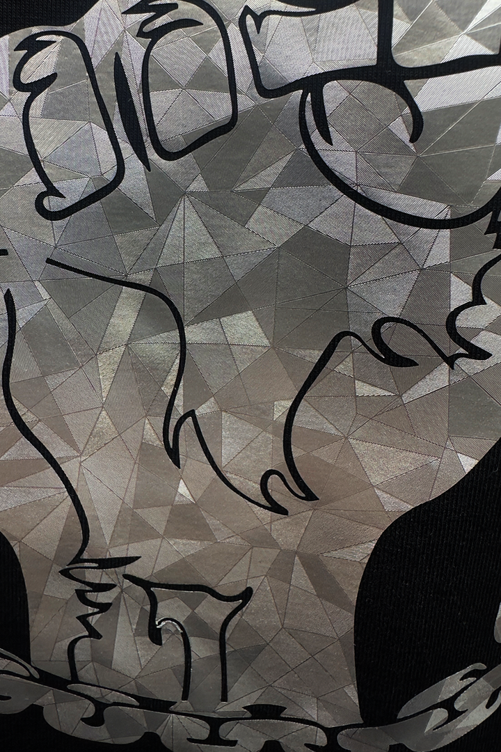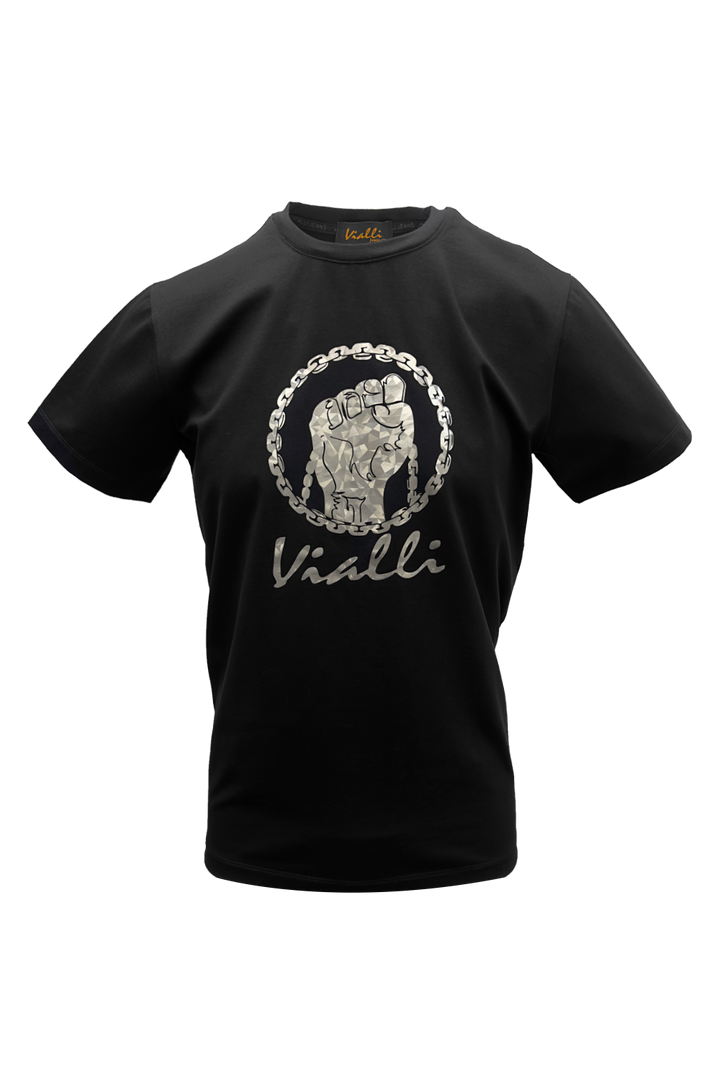 The Vialli Lanvin T-Shirt from the Summer collection combines cotton and spandex for a comfortable, flexible fit. Its plain back contrasts with a distinctive mosaic pattern on the front, highlighting the iconic Vialli fist design. This blend of style and comfort makes it ideal for warm weather while maintaining a sleek, modern look.