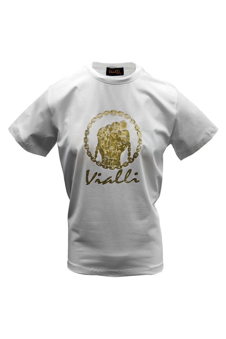The Vialli Lanvin T-Shirt from the Summer collection combines cotton and spandex for a comfortable, flexible fit. Its plain back contrasts with a distinctive mosaic pattern on the front, highlighting the iconic Vialli fist design. This blend of style and comfort makes it ideal for warm weather while maintaining a sleek, modern look.