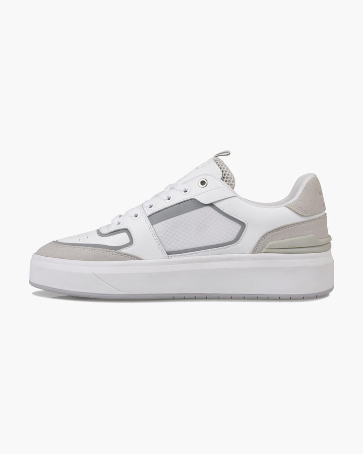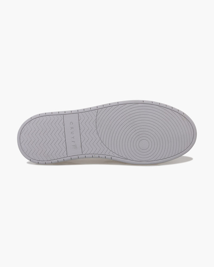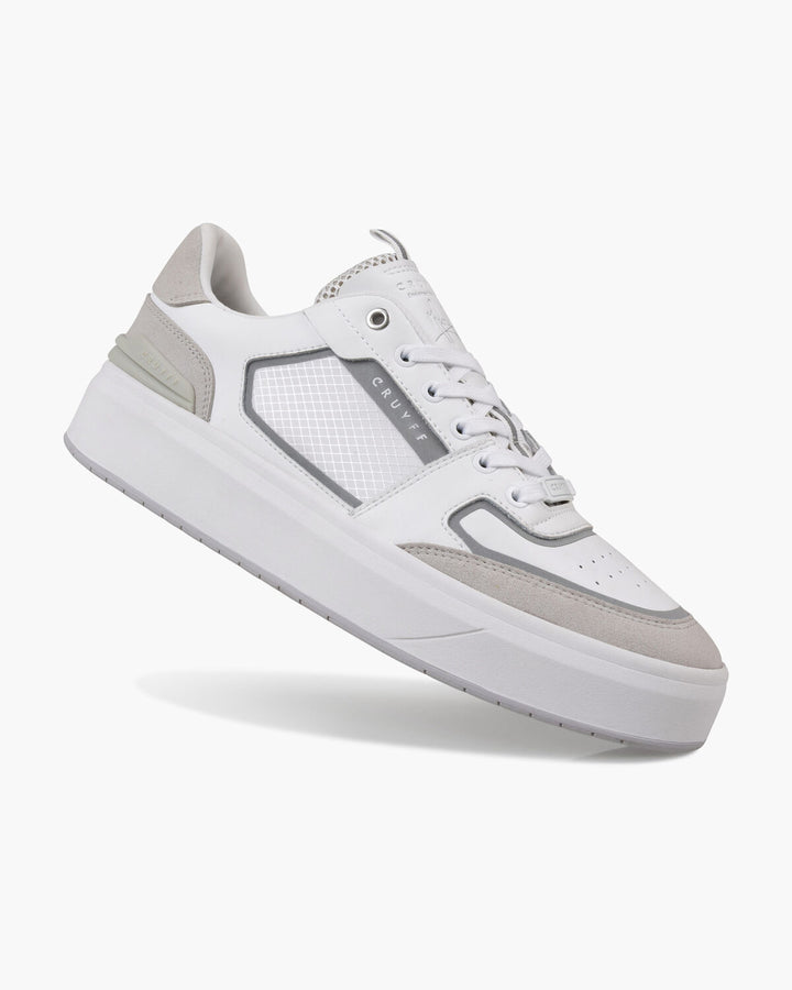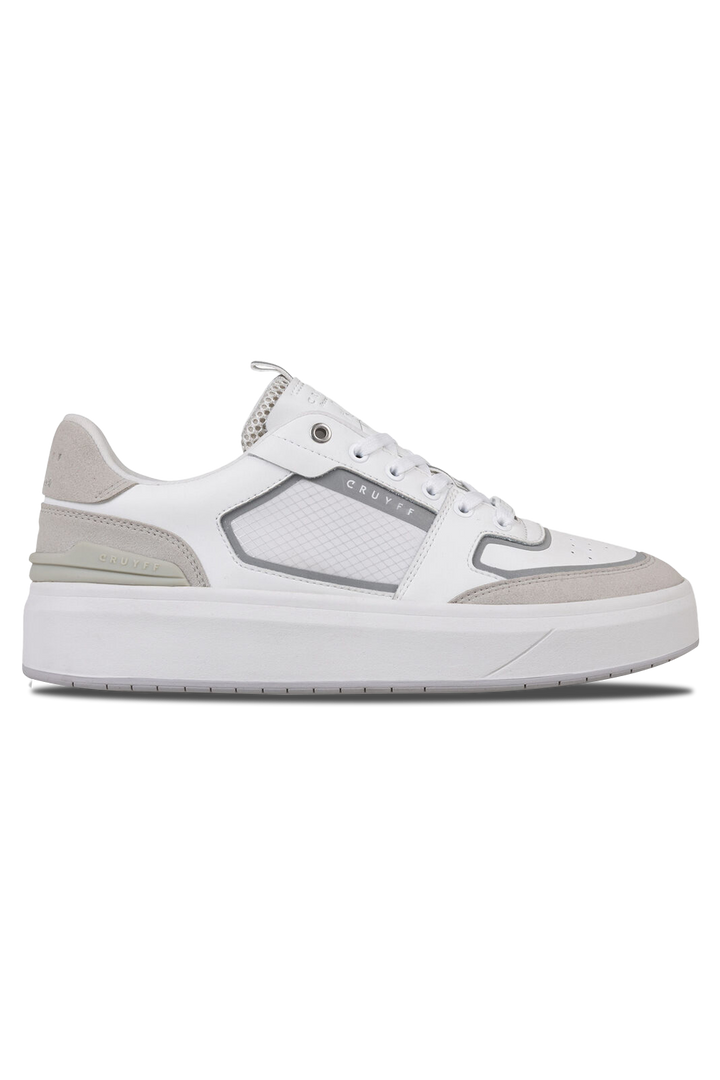 The Cruyff Endorsed Tennis in White for men. A sneaker made with soft leather, reflective ripstop side panels, and reflective underlays. The Endorsed Tennis pays homage to Johan Cruyff's bold charisma on and off the field, with a signature endorsement on the tongue. Removable cushioned insoles and a custom lace tag provide comfort and character. Branded RB cupsole with spoiler.